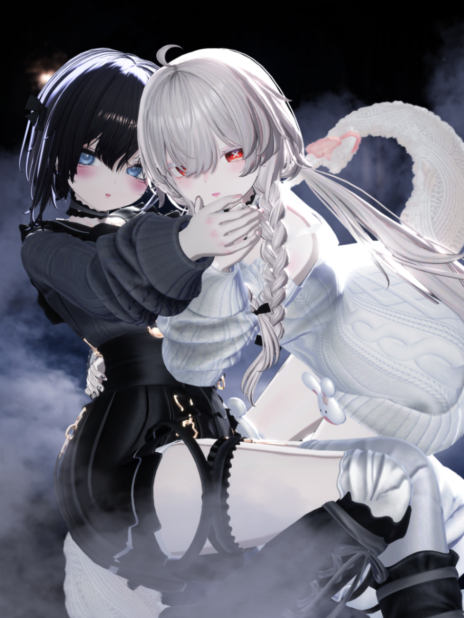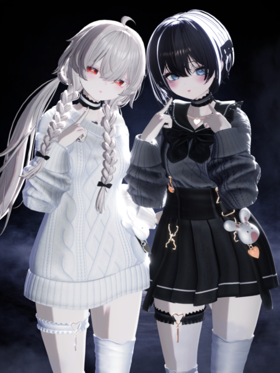白と黒、それぞれ違う雰囲気の2人を並べて撮ってみました! ニットのやわらかさとレザーの質感、なにより逆光がとっても綺麗な衣装でお気に入りです! 静かな空気感の中で、2人のコントラストと逆光が自然に映える感じにっ!!