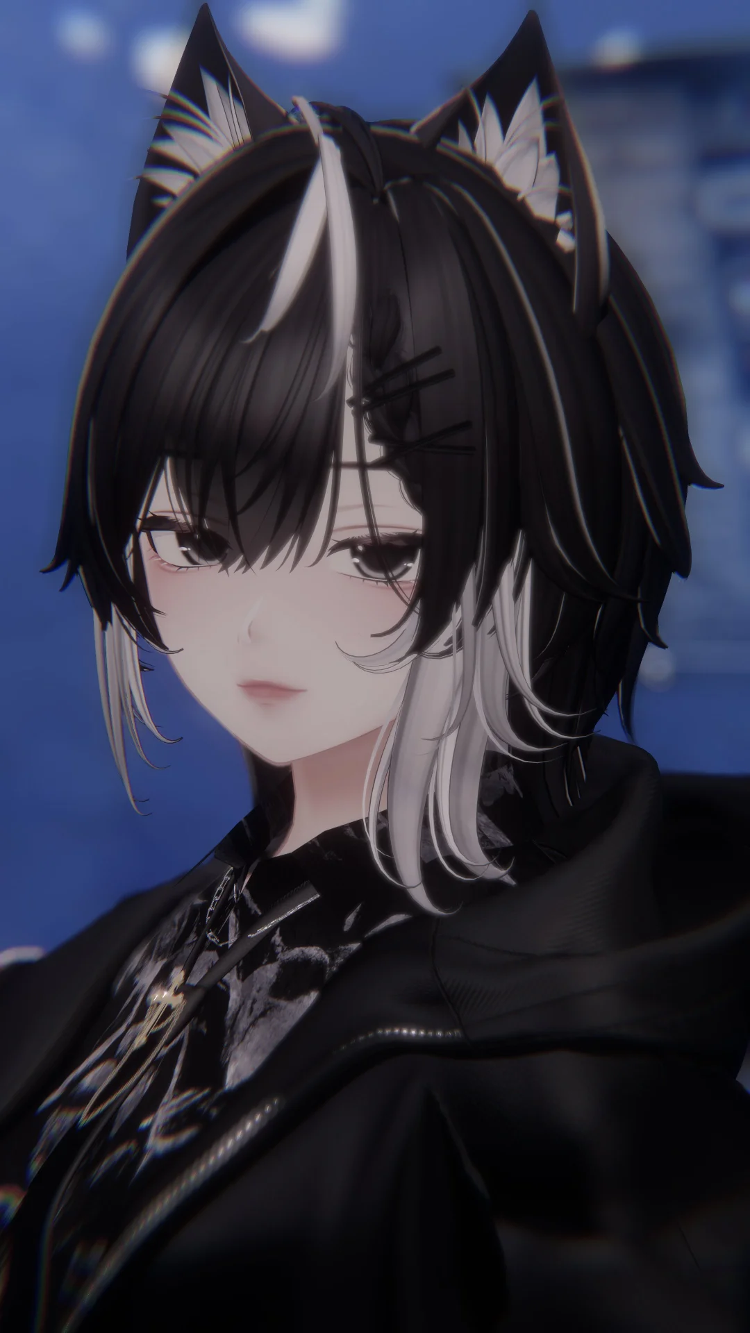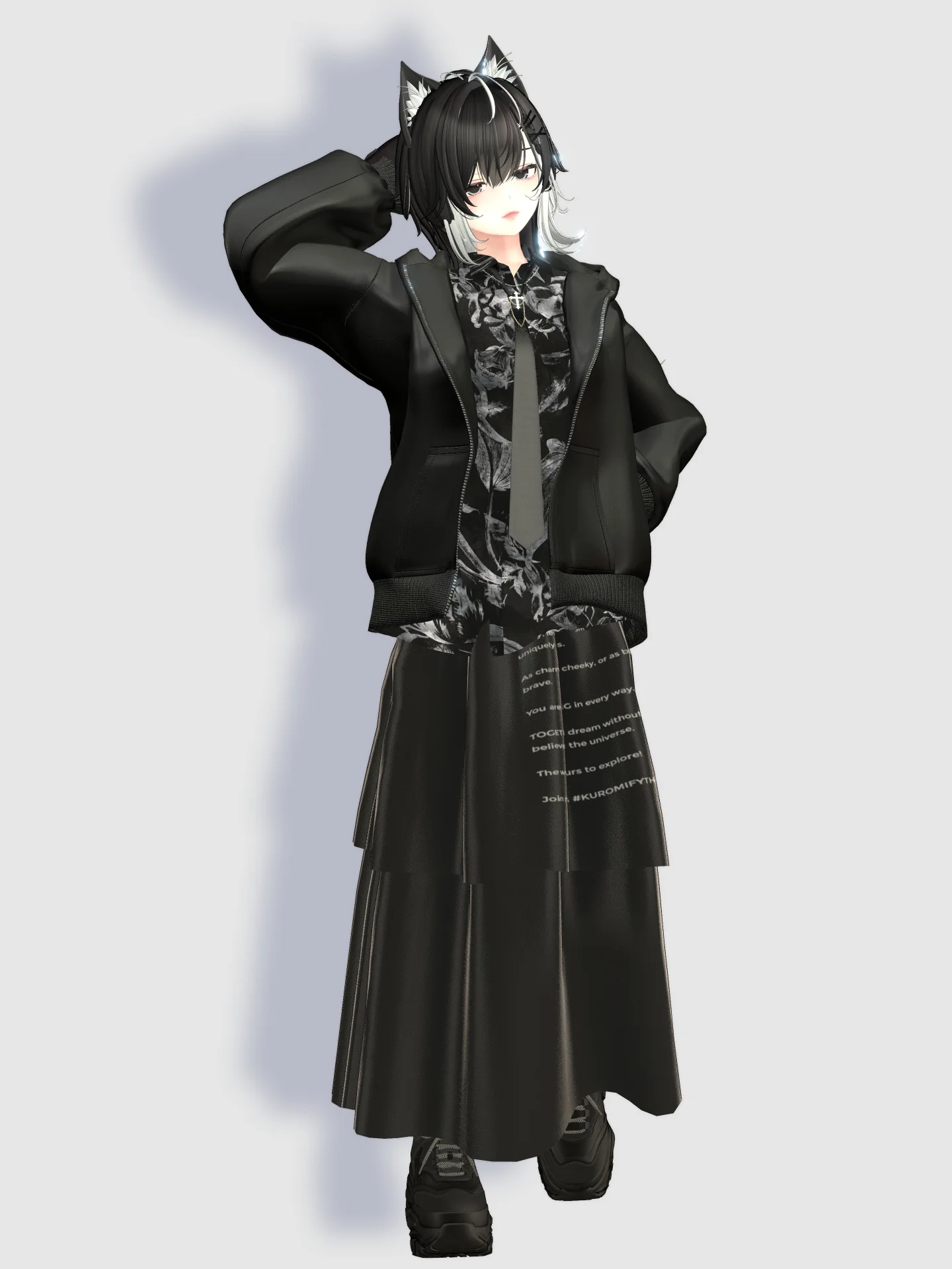 黒髪メッシュ × 色白スキンに合わせて、全身をブラックのワントーンで統一。