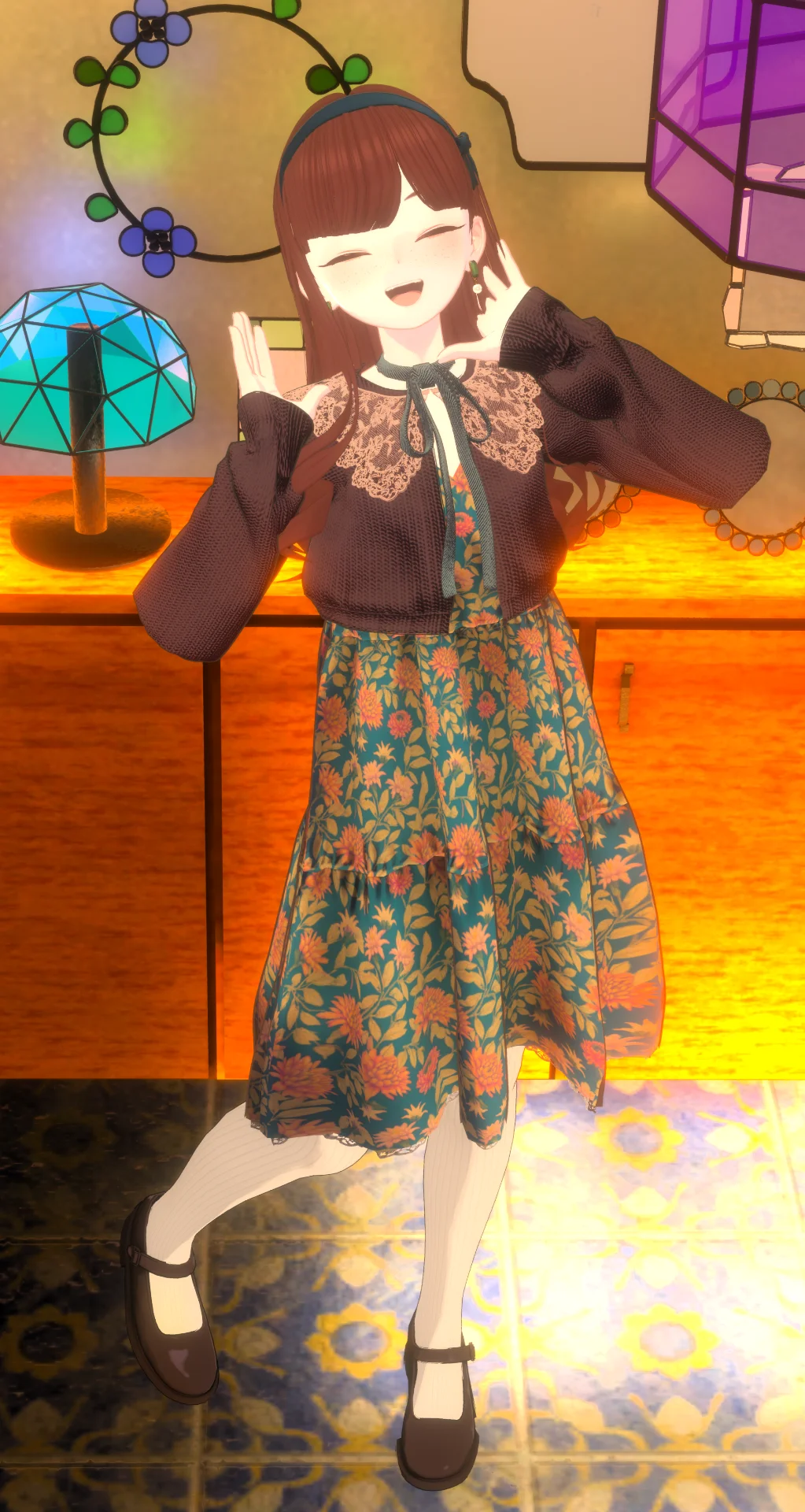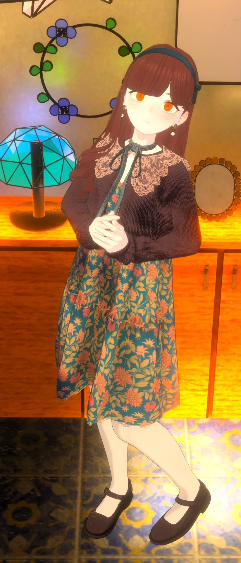 acottoさんのチュニックワンピースの花柄が素敵だったので組んだ改変です!ススキヤさんのアイメイクテクスチャの色味と合わせてアンティークな場所が似合う温かみのある可愛いらしさが表現できたかなと思います!イヤリングはRaramani-Örnさんのトラッドスタイルに付いているイヤリングです!