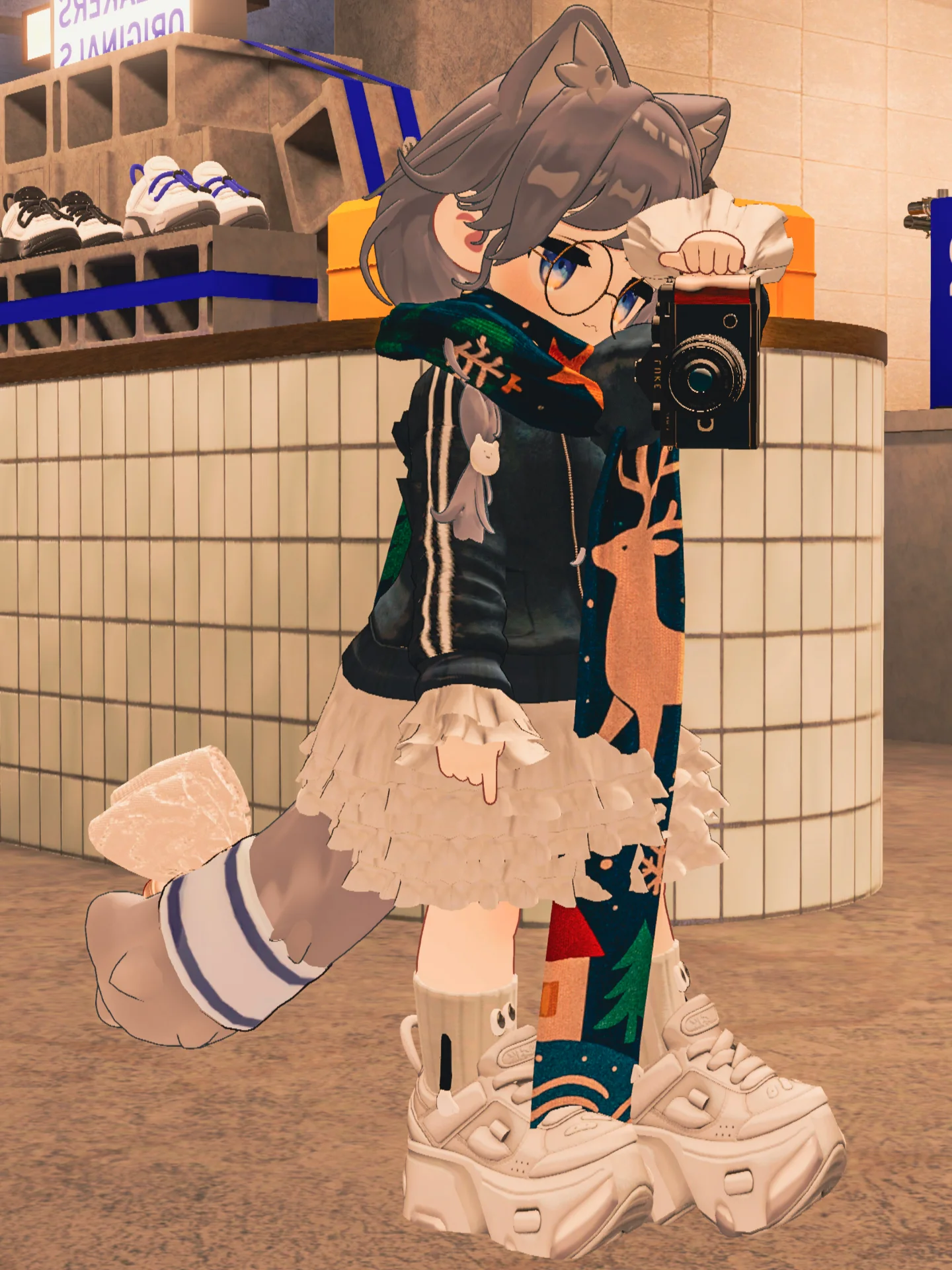 おっきくなりがちなキプフェルのスニーカーをソールの厚さを自由に変えられる足踏SNEAKERSさんのWARVであえて厚底に、結び目をオフして足元を少しすっきりさせてバランスをとりました。