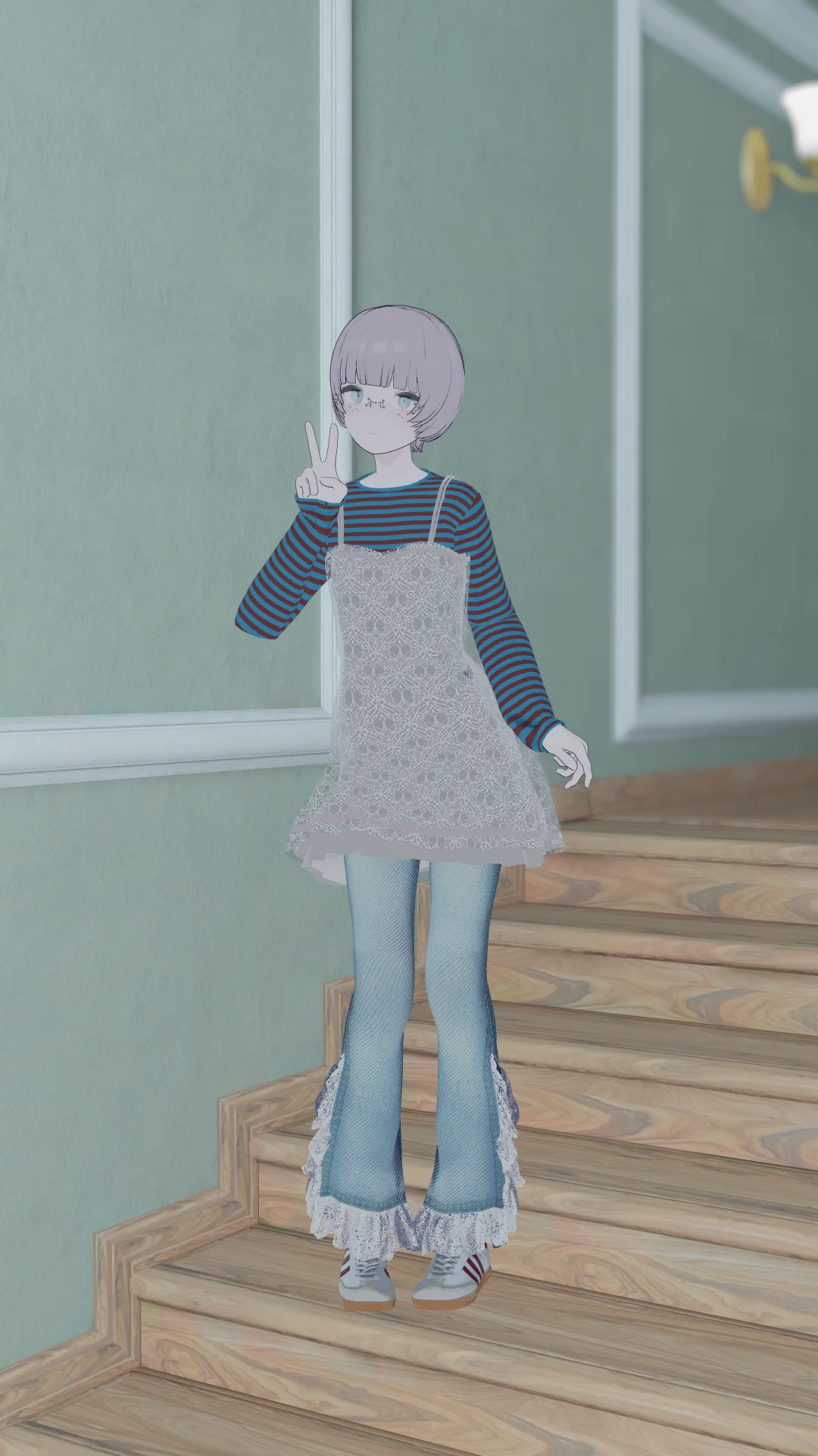ボーダーTにレースワンピースを合わせてみました。 ▼改変時のコンポーネント設定 WAVEV「Stripe Long Sleeve Tee」 ・Inner_Fit_1シェイプキーの数値を100にしました。 ・MA Shape ChangerにupperChestHide1,upperChestHide2,lowerChestHide,spineHideを追加しました。またupperChestHide1はDeleteではなくSetにし、数値は70にしました。 melowvr様「Muted Ganache」 ・Inner.corset,lace onepieceを使用させていただきました。スケールを1.1倍にして位置を合わせました。 その他アイテムはデフォルト設定で使用しました。